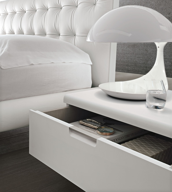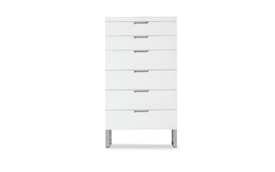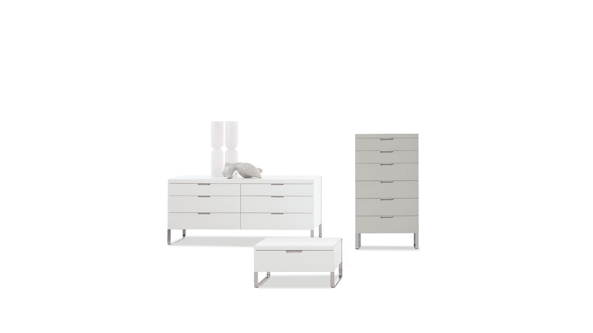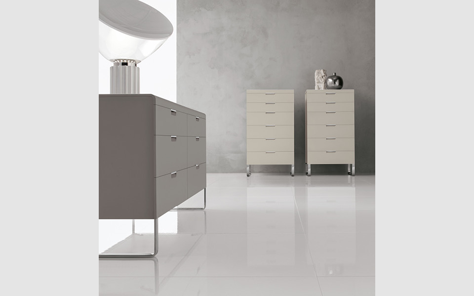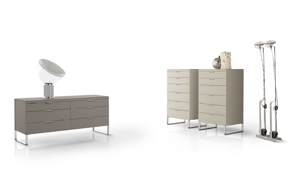 Structure en MDF laqué brillant ou mat. Tiroirs avec guides métalliques de freinage et front laqué mat ou brillant. Poignées en métal. Piètement en acier chromé ou laqué.