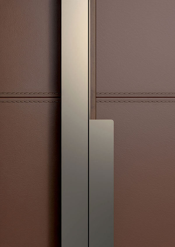 Les portes, avec cadre en noyer canaletto massif, sont disponibles en finition cannelée noyer canaletto, laquées mates ou revêtues de cuir sellier enrichi de coutures réalisées avec un fil ton sur ton. Les portes peuvent être équipées d’une ouverture push-pull ou de poignées décoratives en métal peint.