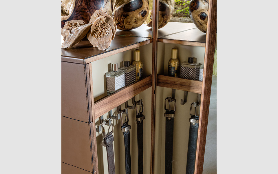 Structure en chêne thermo-traité ou noyer italien. Plateau et tiroirs revêtus en cuir avec couture décorative. Poignées en cuir et nickel noir satiné. Portes latérales en chêne thermo-traité ou noyer italien, qui peuvent être ouvertes, avec miroir. Équipé avec compartiments de rangement latéraux et crochets pour les ceintures.