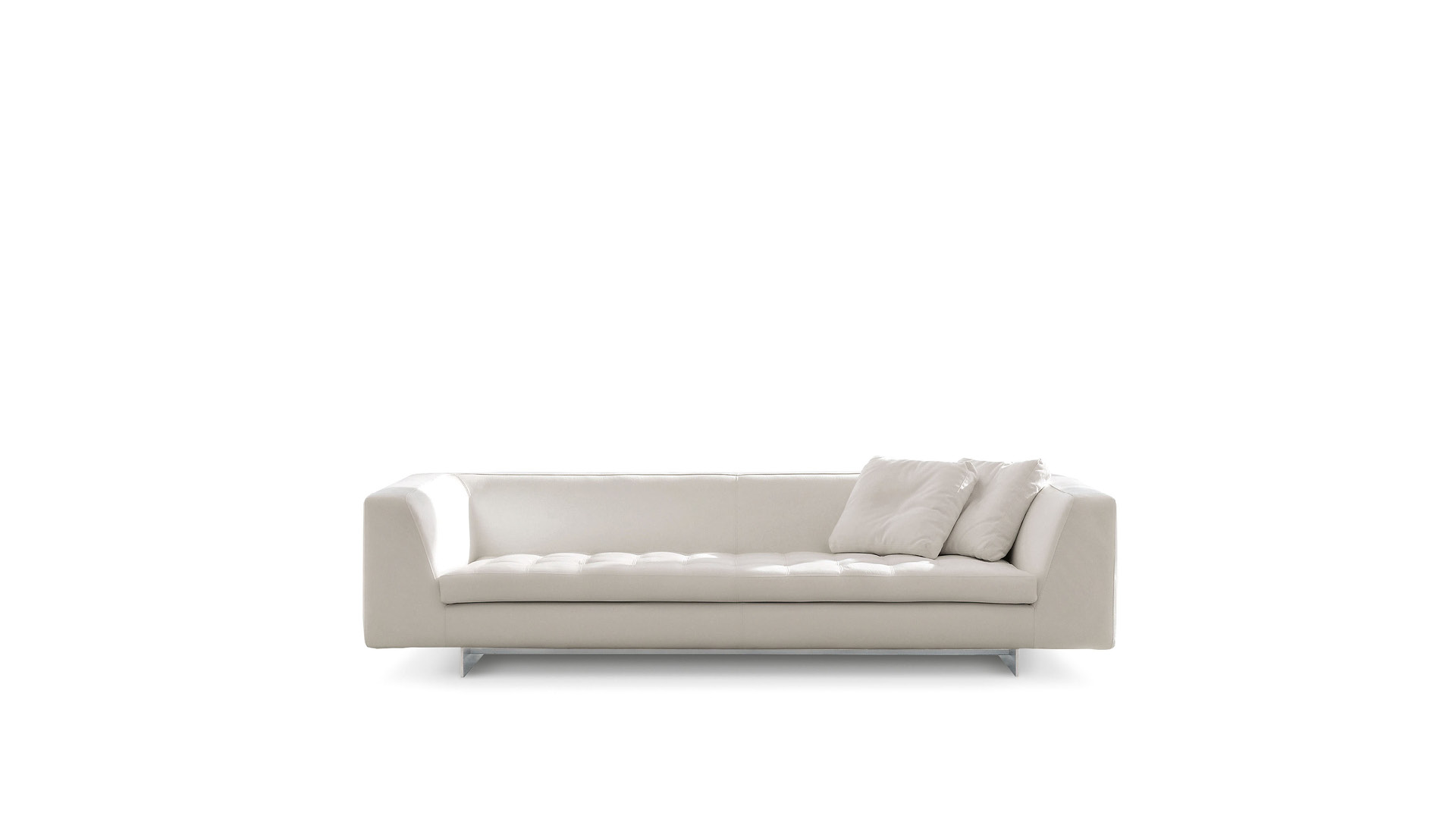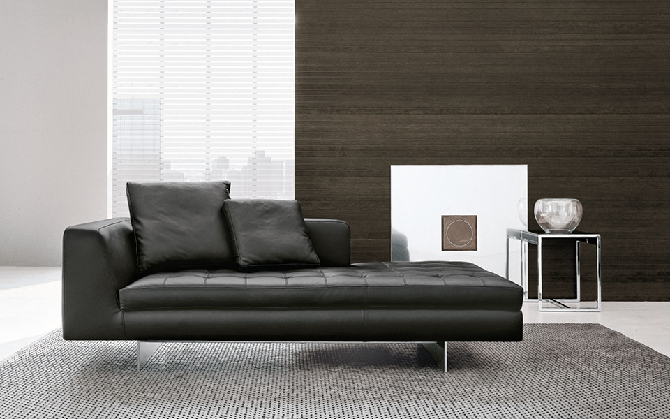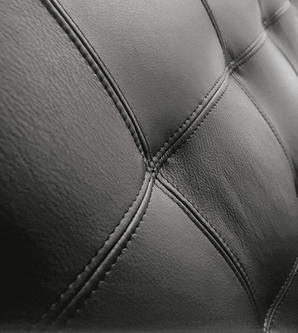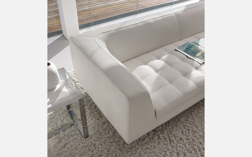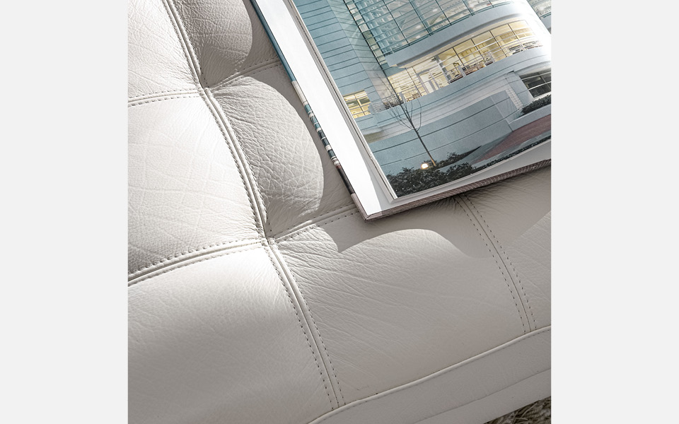 La personnification de la commodité. L'assise est spacieuse, pour un confort optimal, tandis que le dossier et les accoudoirs sont légèrement inclinés pour favoriser la position correcte. Le matelassage de l'assise du divan HAERO est réalisé avec une application artisanale, comme en témoignent les coutures à vue, preuves d'un soin sans égal dans la fabrication.