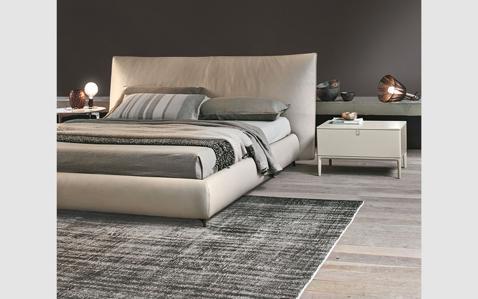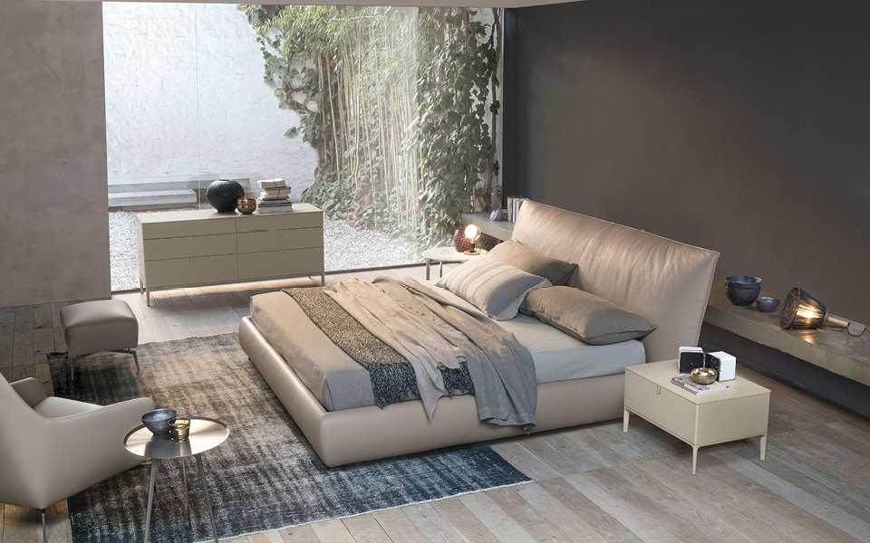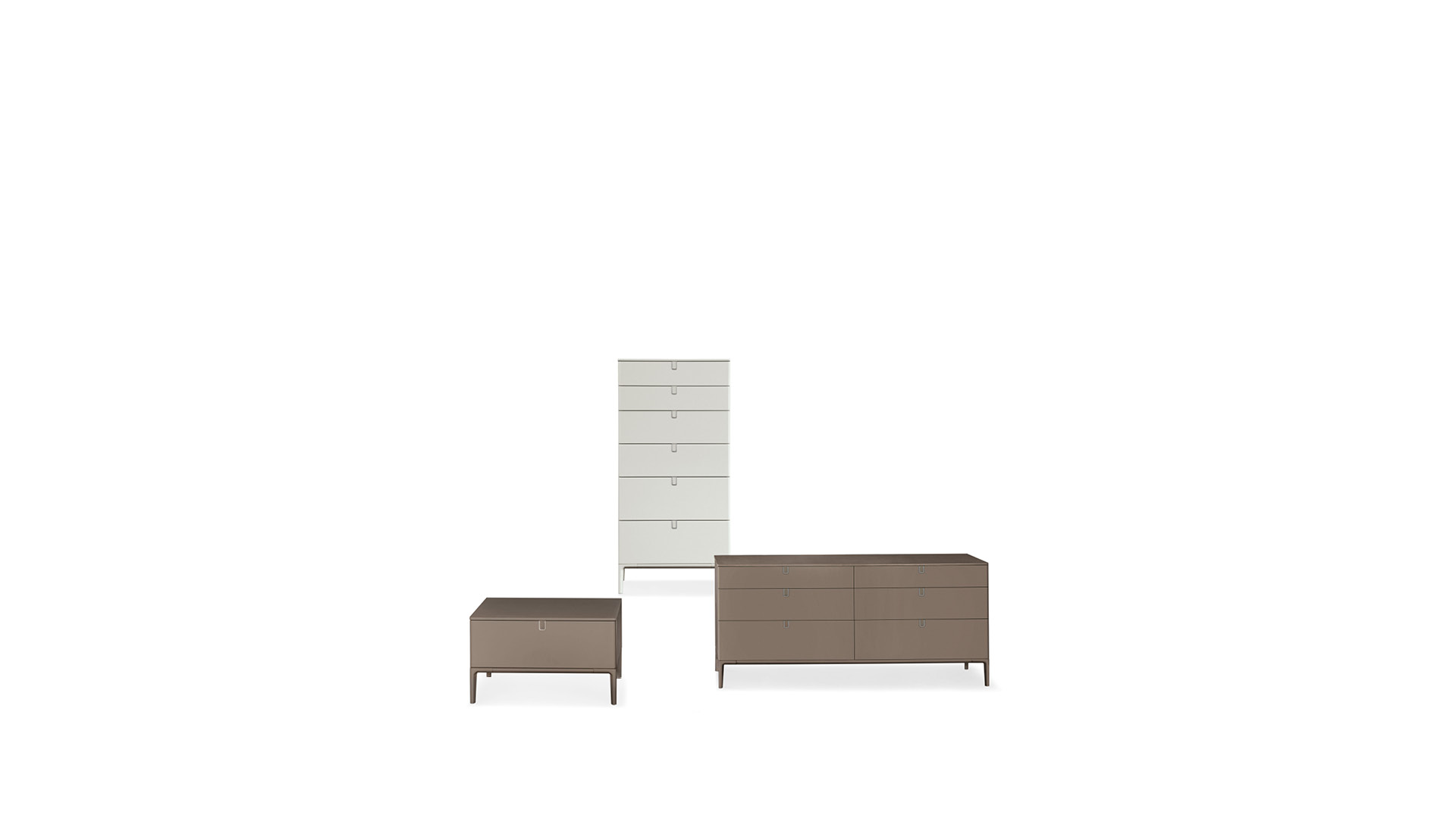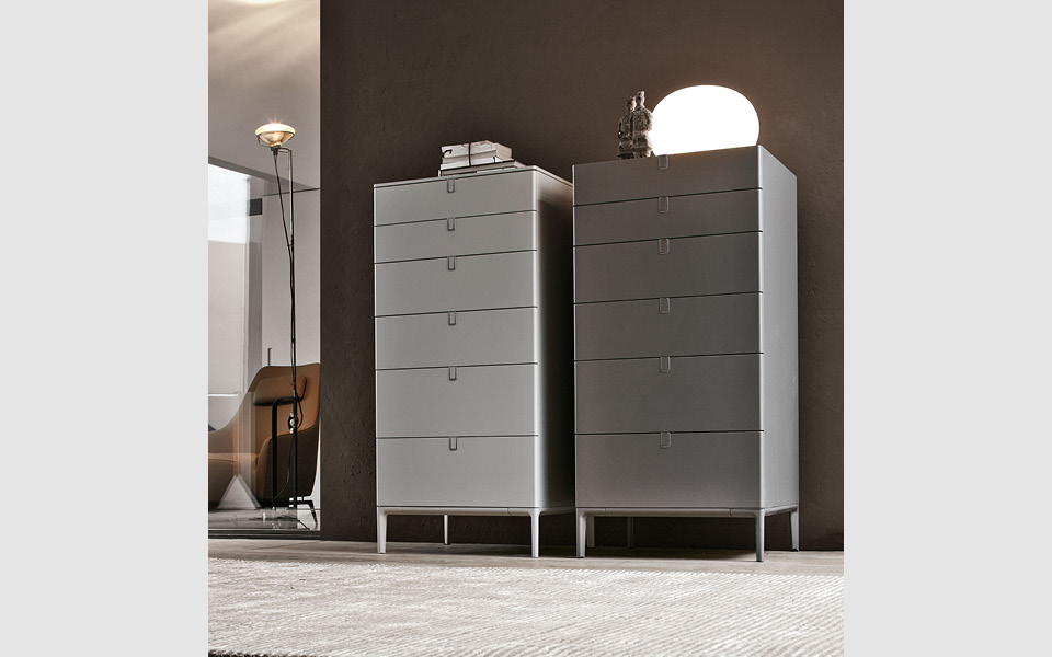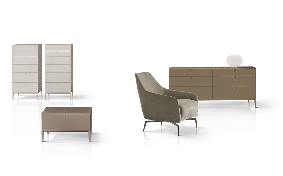 Une série d'accessoires laqués composée de commodes, tables de nuit et chiffonniers. L'élégance est mise en valeur par la forme de la poignée qui garantit la continuité esthétique et par la finesse des pieds en fusion d'aluminium peint ou brillanté.