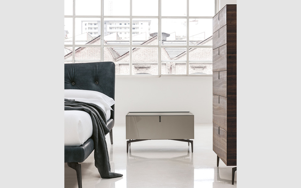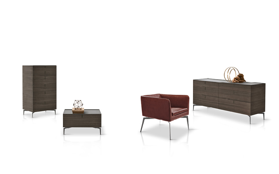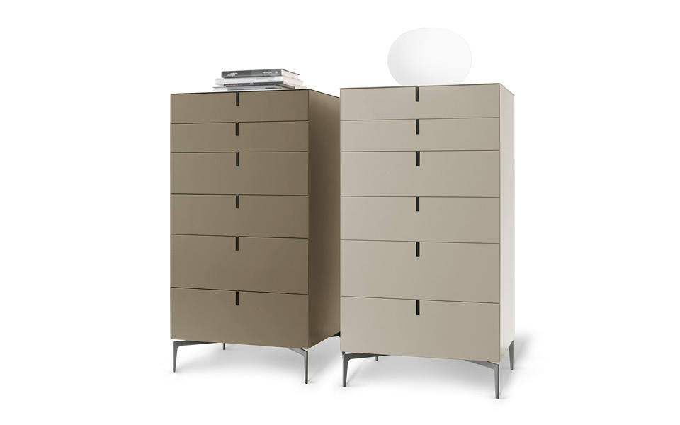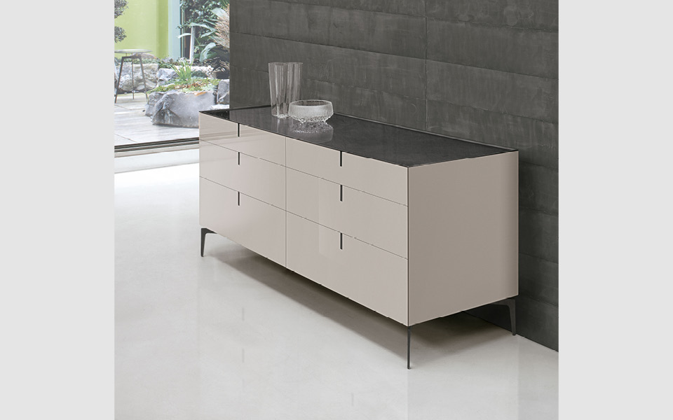 Les accessoires Meridien sont épurés dans la forme mais sophistiqués pour les détails qui le rendent unique : les petites poignées à ras semblent invisibles parce qu'elles permettent de maintenir la continuité de la surface ; le plateau supérieur en acier est peint comme la base.